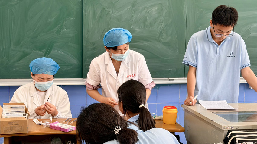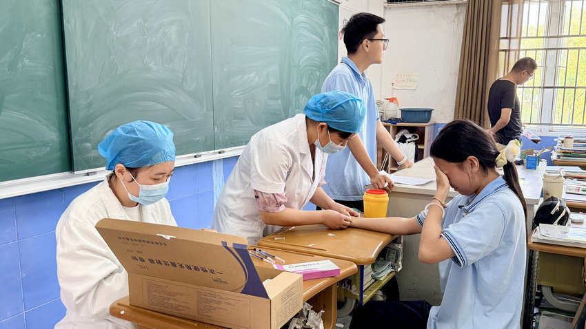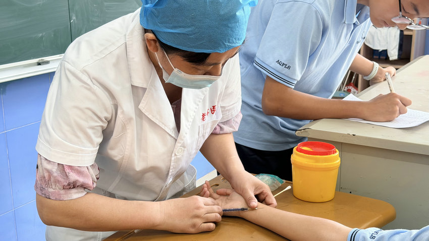 筛查时,同学们在班主任引导下以班级为单位有序配合。不少同学虽略带紧张,仍勇敢伸出手臂。医护人员操作时动作轻柔,同时以轻声安抚的方式缓解学生情绪,让现场的紧张氛围逐步消散。完成筛查后,同学们脸上均露出轻松的笑容,显然在感受到医护人员的温和态度与班主任全程的鼓励支持后,此前对筛查的顾虑已全然打消。各班班主任全程坚守教室,既提前做好人员组织、场地协调等工作,又在现场耐心答疑、安抚情绪,成为筛查工作的“定心丸”。师生默契配合,让整个过程忙而不乱、秩序井然。
