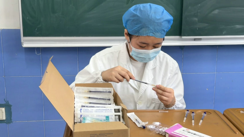 当天,高一年级每间教室临时变身为“健康筛查站”。医护人员身着整洁的白色工作服,头戴蓝色医用帽、口罩严护口鼻,携带专业医疗设备与耗材来到班级。他们打开标注“一次性使用无菌注射器”的纸箱,认真核对、组装筛查器具(如图中医护人员专注整理医疗耗材的场景),从准备工作到结核菌素试验,每一步都严谨细致,尽显专业与负责。