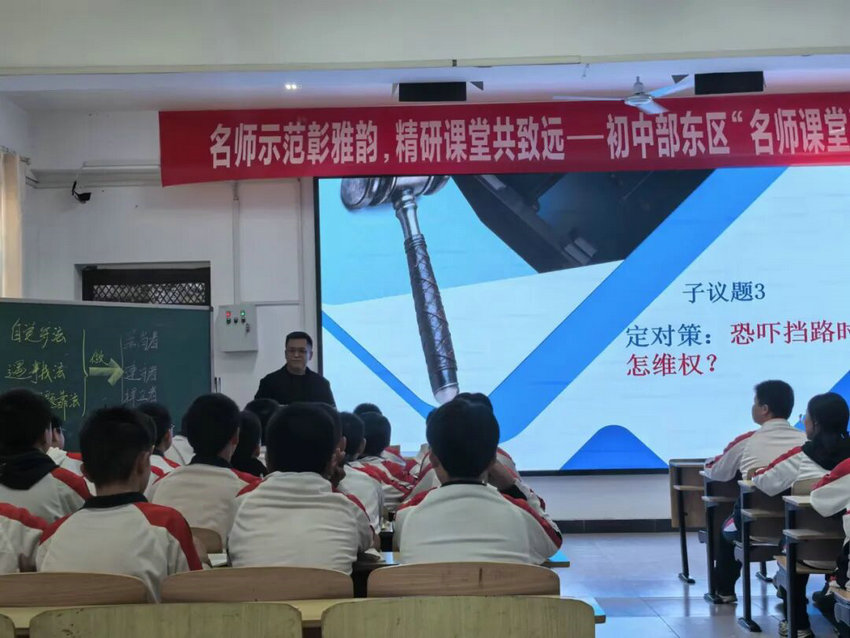 小课堂连接着大社会,马伟老师用一个个小故事和精彩的师生互动让学生明白“规则是自由的铠甲”。而把“法治”从书本概念变成“生活智慧”,这其中的思辨过程恰是在帮助学生搭建法治概念的框架和逻辑思维的台阶。在分析与讨论中,学生对法律的敬畏感与认同感增强,同时也学会用法治思维守护自我成长之路。