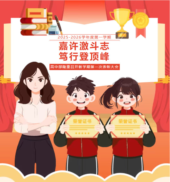 金秋时节,硕果飘香。为表彰先进、树立榜样,激发全体高中部学生的学习热情,10月24日下午,我校高中部隆重召开新学期第一次表彰大会。肖清克副校长、徐最太校长助理、王银钗主任、副主任徐海宏、朱炎炎出席大会,为获奖个人与集体颁奖,全体师生共同见证荣耀时刻。本次表彰大会由高中部副主任江生友主持召开。