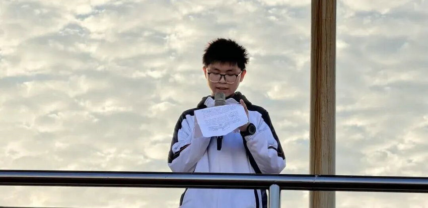 大会第二项,学习经验分享。高一(5)班魏丙宗同学,为全场师生带来干货满满的分享。他结合自身经历,毫无保留地讲解学习方法与心得,案例生动、技巧实用,既让同学深受启发,也为后续学习指明方向。