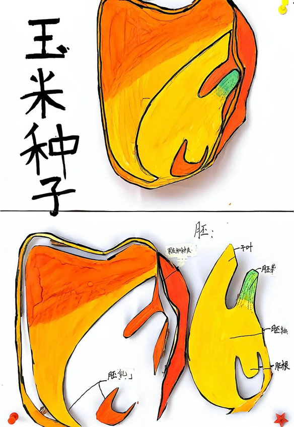 一颗小小的种子藏着长成参天大树的全部可能。“种子结构”作品里,有棕色黏土捏出坚韧种皮,有内部填充黄色颗粒模拟的胚乳,轻轻掀开就能看到胚根、胚芽与子叶的清晰排布。这些作品让“种子萌发”不再是课本上的文字,而是触手可及的“生命启动指南”。