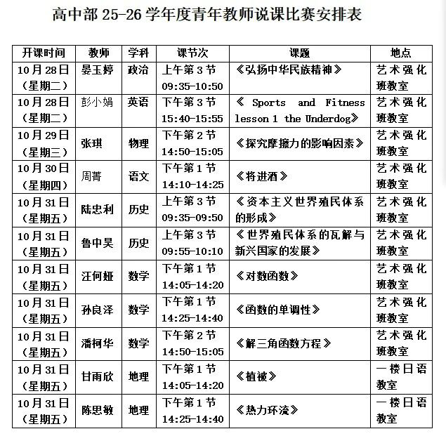 青春逢盛世,奋斗正当时。为进一步提升青年教师的教学素养与说课能力,营造浓厚的教育教学氛围,10月28日至31日,我校高中部成功举办了青年教师说课比赛,副校长肖清克、学部领导及各学科教师参加本次活动。