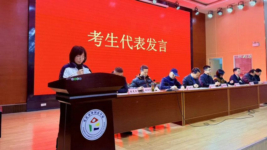 学生代表李书昀同学的发言真挚动人。她怀着感恩之心向学校和家长表达了由衷的谢意,同时真诚地分享了自己在备考期间的宝贵经验与心得体会。字里行间都流露出她积极进取、永不言弃的精神,展现了我校学子勇往直前、追逐梦想的坚定信念。