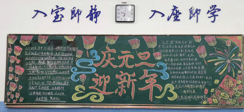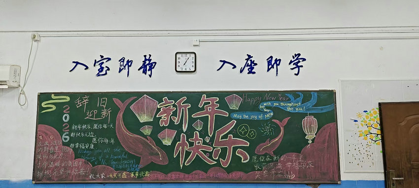 冬韵渐深,年味悄临。为营造温馨祥和的迎新年氛围,搭建学子创意表达与集体协作的平台,近日,我校高中部“庆元旦・迎新年”主题黑板报创作活动全面开展,各班级以粉笔为媒介、黑板为画布,将新年期许与青春活力凝注于一方版面,让冬日校园晕染出融融暖意。