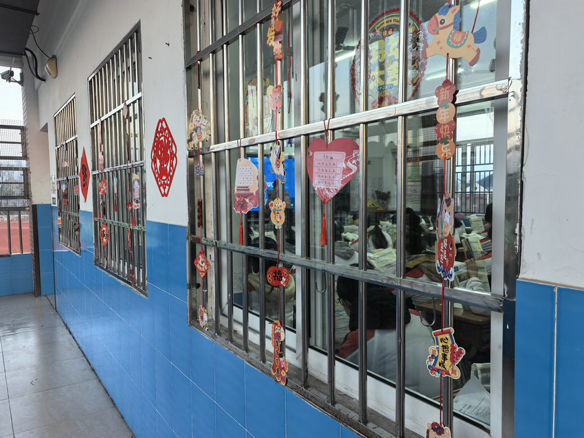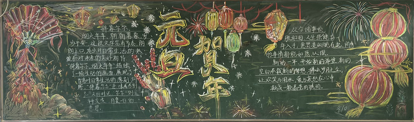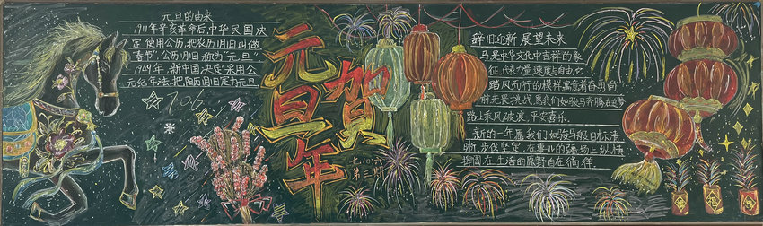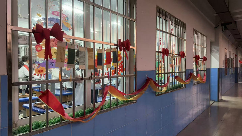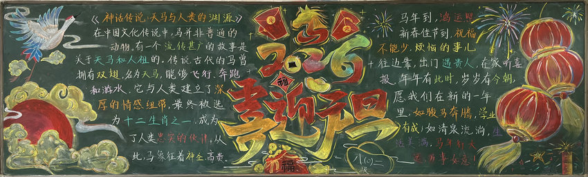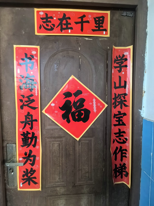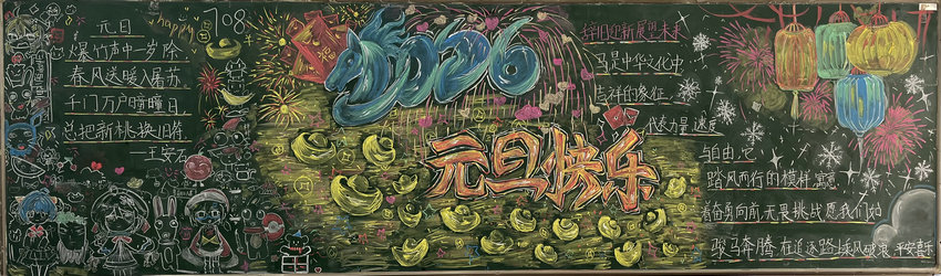 各班师生分工协作、各显神通。黑板成了大家挥洒创意的舞台,有的班级以“马年大吉”为主题,绘出腾跃的奔马、绽放的红梅与金黄的福字,色彩明艳夺目;有的班级融入诗词元素,将“爆竹声中一岁除”等经典诗句与插画结合,笔墨间尽显文雅韵味。窗户则是年味的展示窗口,同学们剪出的窗花造型多样,锦鲤跃浪、喜鹊登梅、龙马精神等图案精巧别致,阳光透过窗棂洒落,光影斑驳间满是新春的暖意。门框两侧的对联更是点睛之笔,或由书法特长的同学亲笔题写,或由全班共同创作,“龙腾盛世迎新岁,凤舞华章启新程”“书山有路勤为径,学海无涯乐作舟”等对仗工整的语句,既饱含对新年的美好期许,也彰显着班级的精神风貌。
