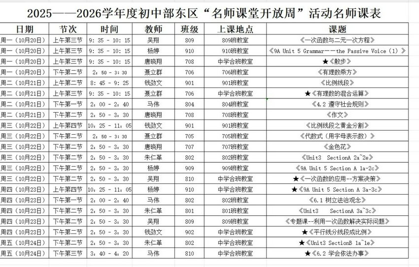 暖阳秋日,桂香阵阵,为探索高效课堂,促进教师专业成长,安庆市外国语学校初中部东区“名师课堂开放周”活动于2025年10月20日-24日开启,七位名师轮番上阵,为我们呈现兼具“质感”与“内涵”的魅力课堂。