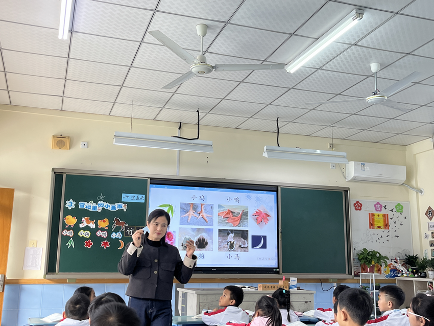 课堂上,黄老师设计多种互动式的小游戏,让一年级学生在直观互动中轻松掌握“动物脚印与画作”的关联,既贴合低龄段认知特点,又以趣味激活了课堂氛围;识字环节突破机械记忆,解析“家”的“宝盖头”造字逻辑、借“数竹叶片数”记笔画,让生字学习兼具文化逻辑与画面感,朗读指导则通过分层训练,帮助学生掌握语气节奏,扎实落实了语文基础。
