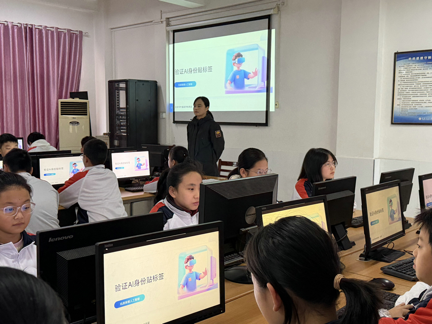 课程面向七年级学生。主讲余汪琴教师以AI生成动态图片巧妙导入,引导学生化身“AI侦探”,在机房中亲身体验AI对话、文生图及图像识别等核心功能。课堂通过制作“AI身份标签卡”的任务,驱动学生在实践中理解人工智能的概念与特征,有效培养了学生的计算思维与批判性数字素养。