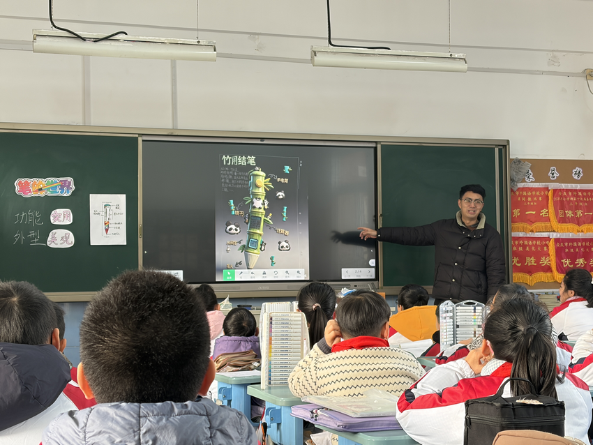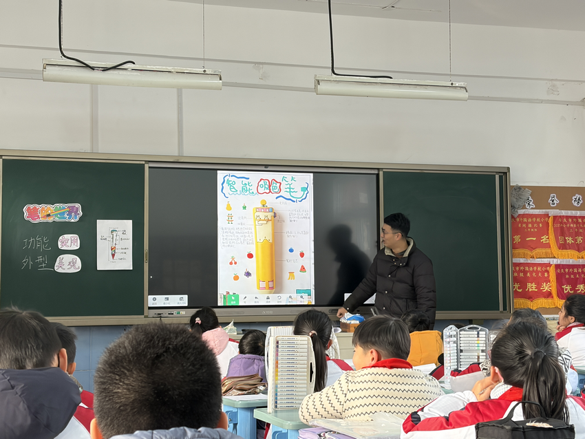 最后,宣老师寄语学生:“希望未来能在文具店买到你们设计的笔,让想法变成现实。”暖心的总结为孩子种下创新种子,也让这节美术课成为连接创意与现实的桥梁。