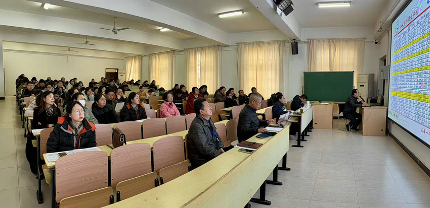 会上,江生友主任首先对本次期中考试成绩进行了详细的数据分析。他从年级整体成绩、各学科平均分、优秀率、及格率等多个维度入手,对比不同班级、不同学科的表现,精准指出了教学中存在的优势与不足。同时,江主任结合具体数据案例,分析了学生在知识掌握、答题技巧等方面的问题,并针对薄弱环节提出了针对性的教学改进建议,为后续教学工作的优化提供了数据支撑和思路指引。