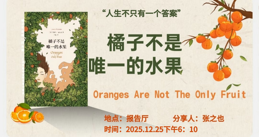 12月25日晚,由张之也老师担任领读,与同事们一同走进英国作家珍妮特·温特森的成名作《橘子不是唯一的水果》,探讨关于成长、信仰与自我选择的深刻命题。