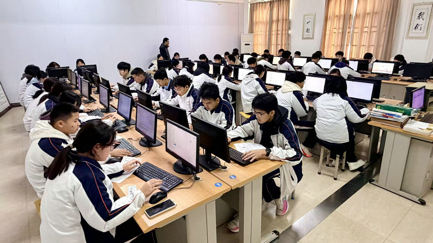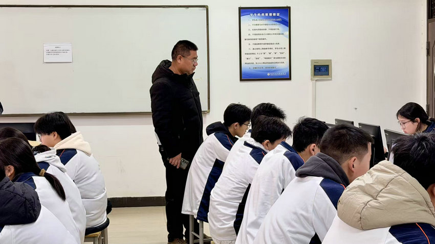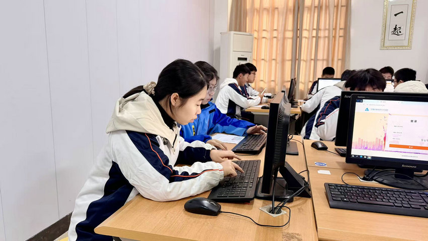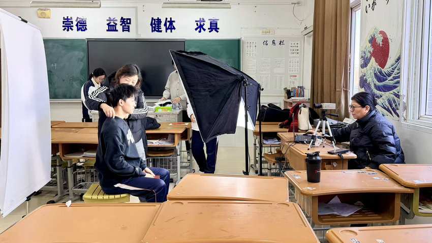 本次报名工作分设线上、线下两大区域同步开展。高中部三楼机房内,学生统一穿着校服,端坐电脑前专注完成信息填报与确认,现场键盘声此起彼伏,秩序井然;一楼外语教室作为人像采集点,专业设备整齐摆放,工作人员细心为学生整理仪容、调试灯光,有条不紊地完成照片采集工作,保障报名信息的规范性与完整性。