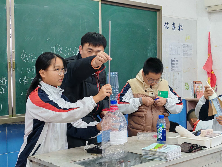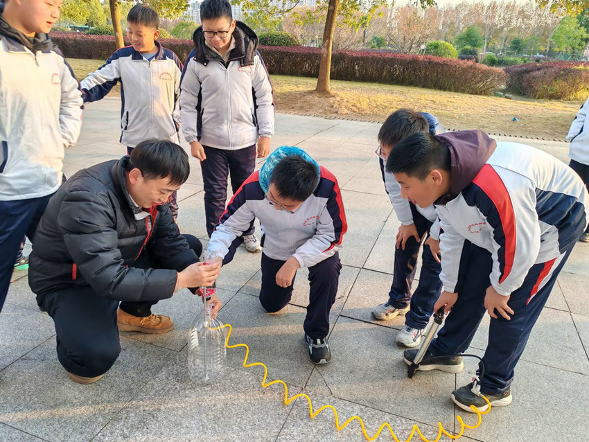 社团指导老师围绕“趣味科学实验”与“创意发明初探”两大主题展开教学。在“水火箭制作”环节,同学们分组协作,将塑料瓶、气嘴、尾翼等材料巧妙组合,从组装瓶身到调试角度,每一个步骤都一丝不苟;“电路搭建”体验区里,大家对照电路图,小心翼翼地连接导线、安装电池与灯泡,当小灯泡成功亮起的那一刻,活动室里响起阵阵欢呼。此外,社团还设置了“科学知识抢答”环节,同学们积极举手、踊跃作答,在一问一答中巩固科学常识,营造出浓厚的科创氛围。