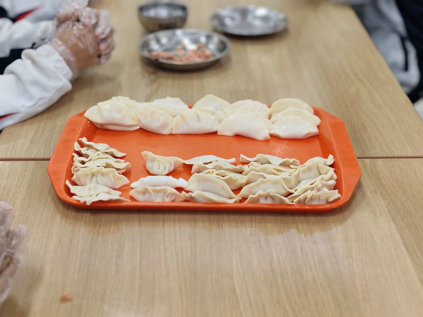 经过一番忙碌,一盘盘形态各异的饺子被送入食堂的后厨。不久后,热气腾腾的饺子出锅了。同学们品尝着美味的饺子脸上满是幸福的笑容。大家一边分享美食,一边交流冬至的习俗,在美味与欢乐中加深了对传统文化的理解。