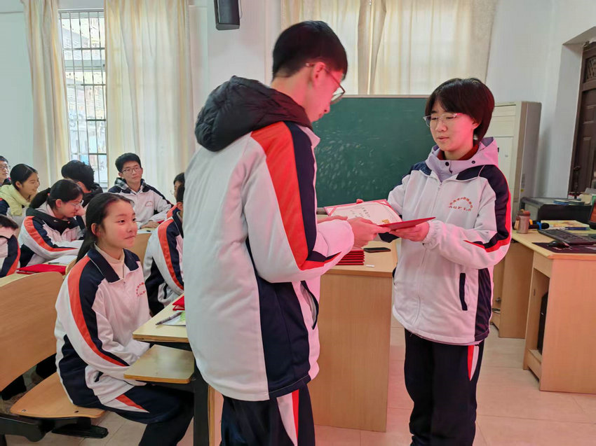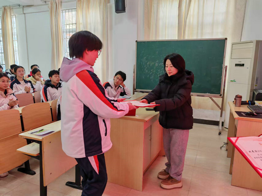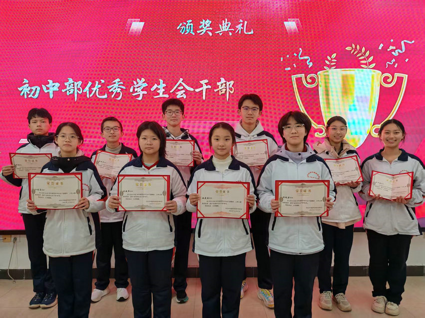 随后,会议进入表彰环节。经过学部审核,综合评定出九年级十位同学因表现优异、甘于奉献荣获“优秀学生干部”称号。徐主任为获奖同学颁发荣誉证书,并号召全体学生会成员以他们为榜样,学习他们认真负责、乐于奉献的精神,共同为校园建设添砖加瓦。