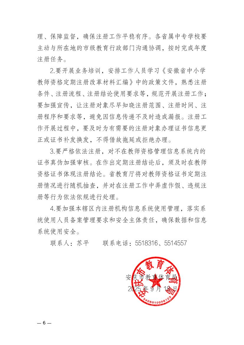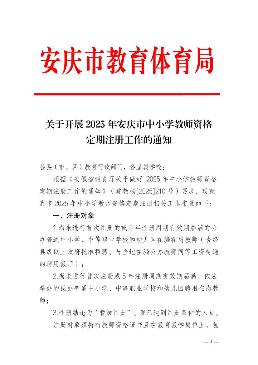 安庆市教育体育局关于开展2025年中小学教师资格定期注册工作的通知