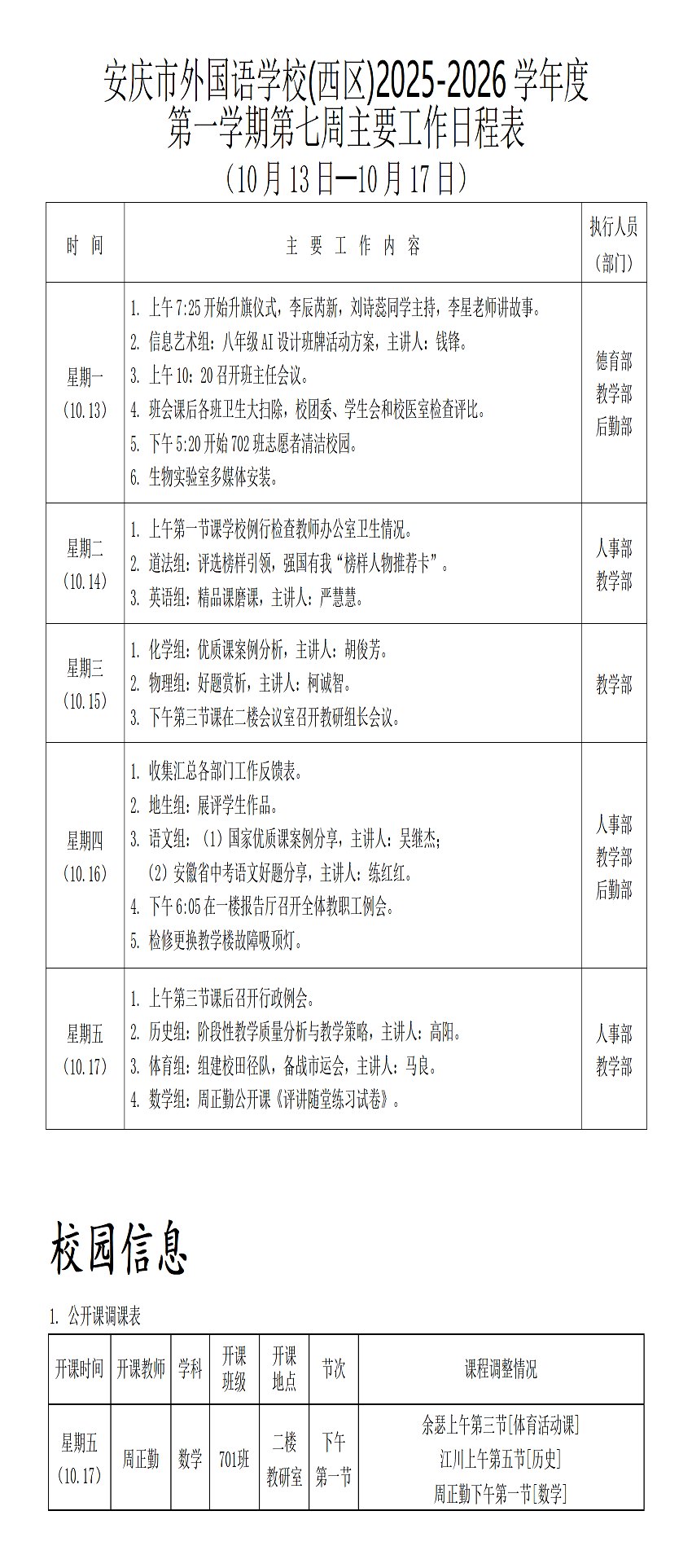2025-2026学年度第一学期第七周行事历(西区)