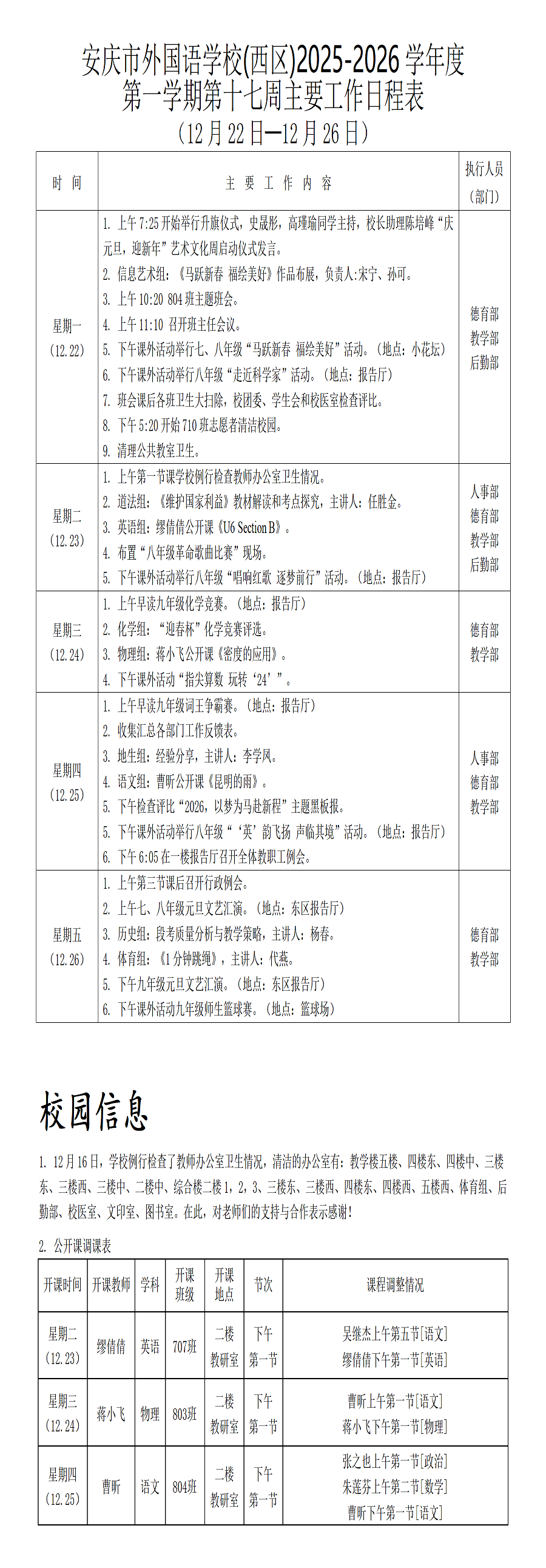 2025-2026学年度第一学期第十七周行事历(西区)