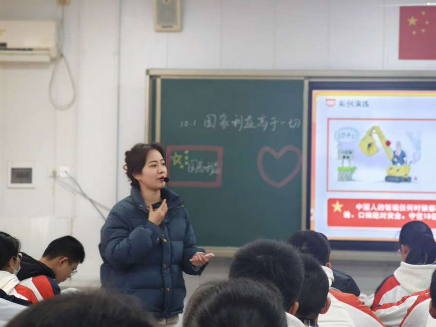 活动伊始,课堂展示环节精彩上演。来自东区的马伊文老师以《树立正确人生目标》为题授课,她以杨振宁院士的人生轨迹为主线,从"个人与社会""自身实际""国家民族利益""人类福祉"四个维度,通过视频播放、小组探究、人生目标分享等丰富活动,引导学生理解个人目标与家国发展、人类进步的紧密关联,将抽象的价值观教育转化为具象可感的成长指引。西区的张之也老师则带来《国家利益高于一切》的精彩课堂,她通过AI赋能组织三师课堂,通过跨学科融合,将历史案例、"国"字演变解析、海外撤侨等真实素材,以议题式教学与互动探究,帮助学生明晰国家利益的内涵与核心内容,深刻理解国家利益与人民利益的高度统一,培育"国兴我荣,国衰我耻"的情感自觉与责任担当。