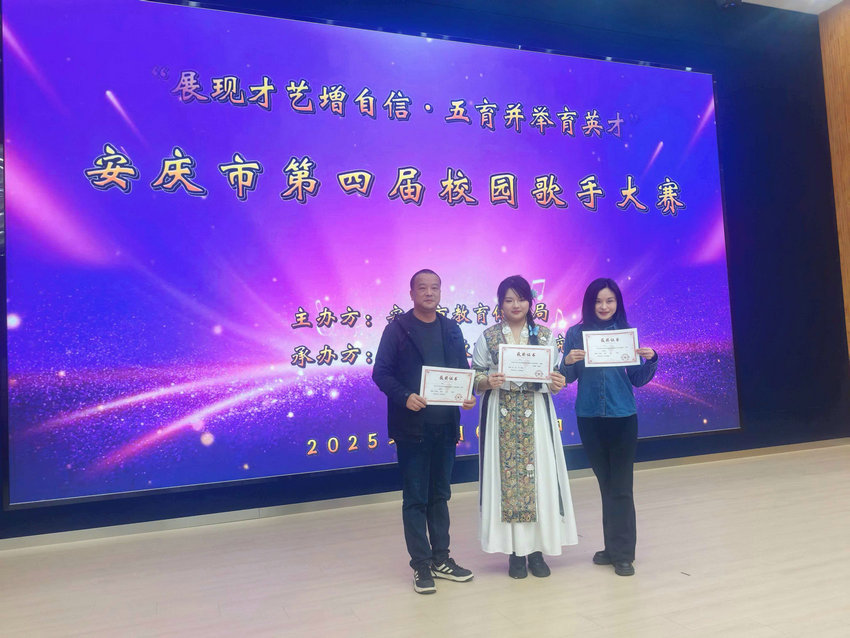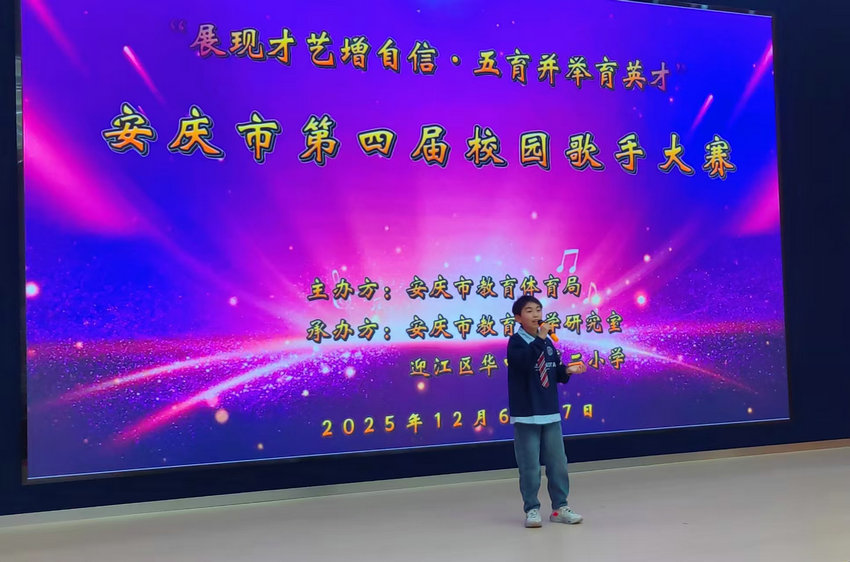 2025年12月6日,在华中路二小举行的安庆市第三届校园歌手大赛中,我校学子喜获佳绩:高中部209班程欣蕊同学演唱的曲目《阿刁》以总分排名第一的成绩荣获一等奖(指导老师:张晖),初中部东区810 班王辰宇同学演唱的《一试有成》荣获三等奖(指导老师:鲁珊)。
