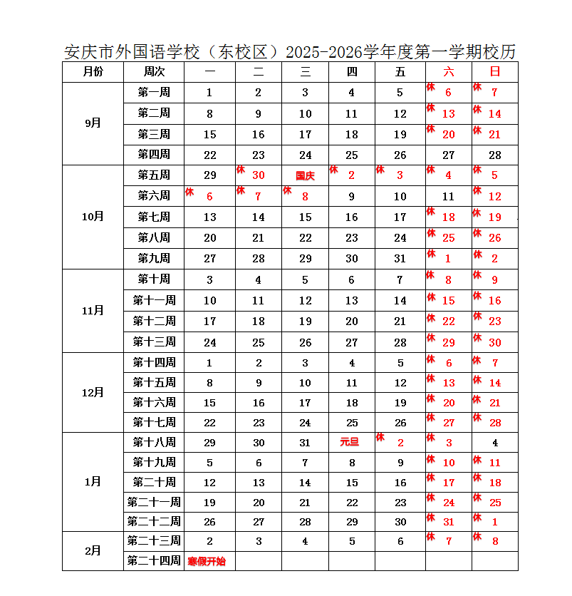 安庆市外国语学校(东校区)2025-2026学年度第一学期校历