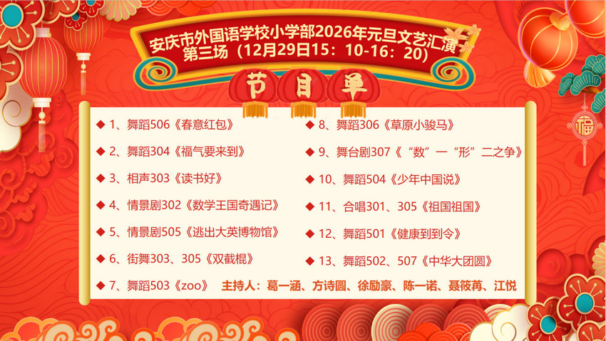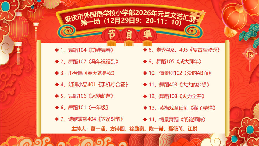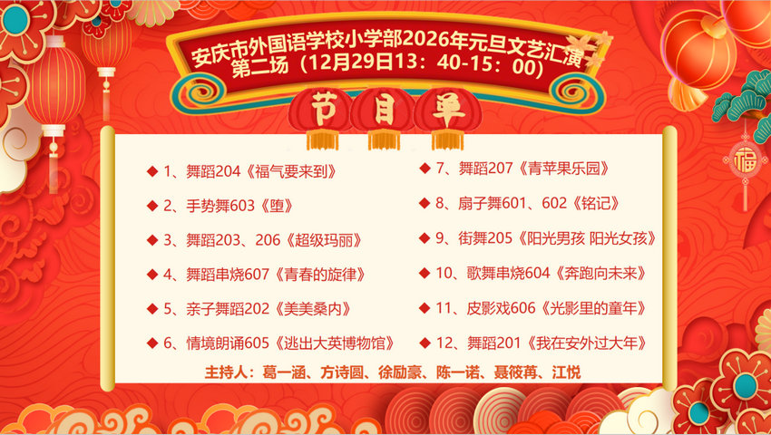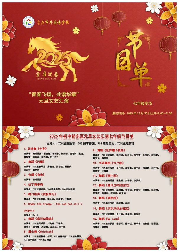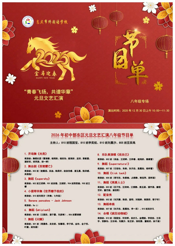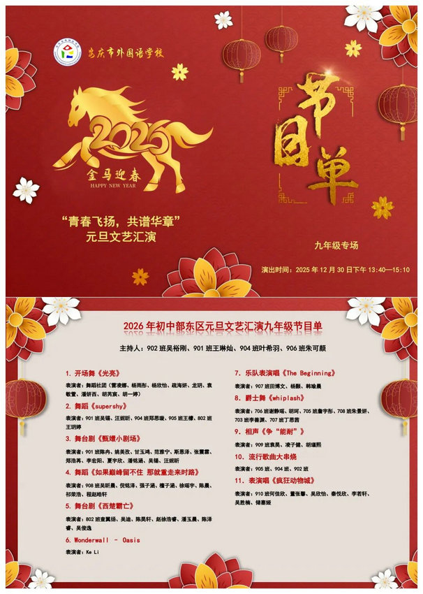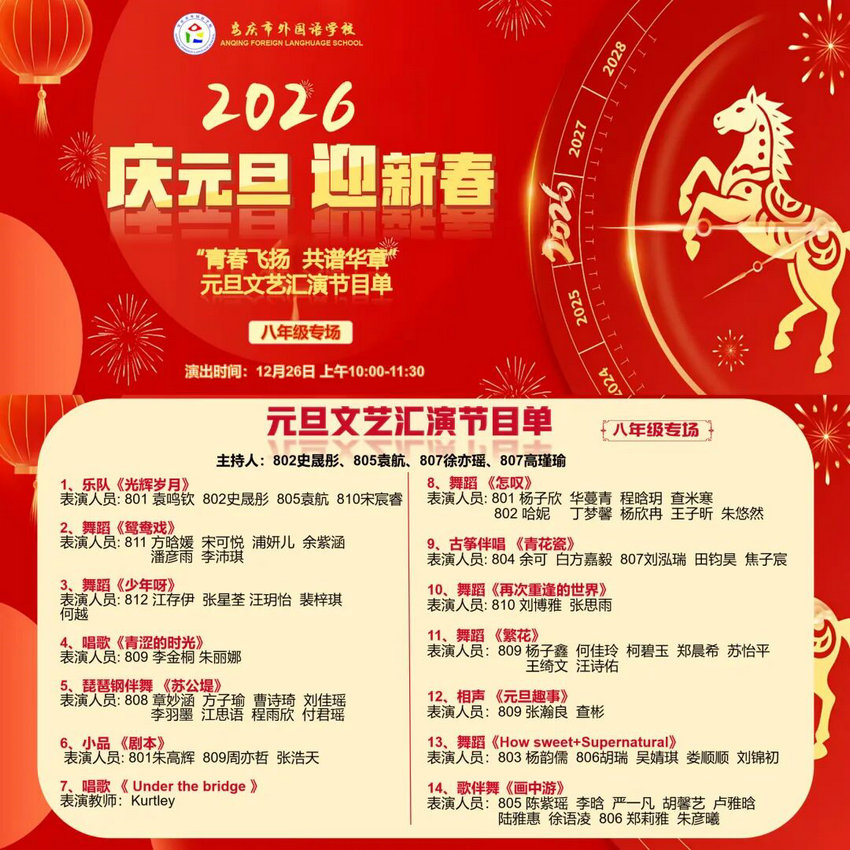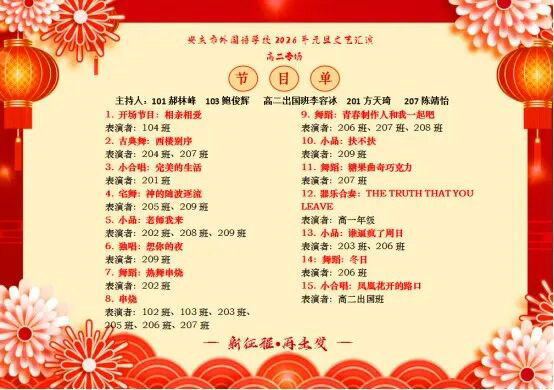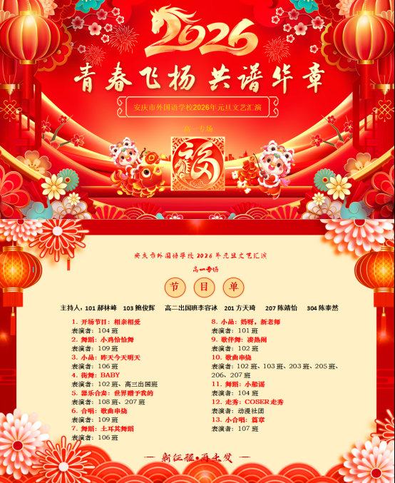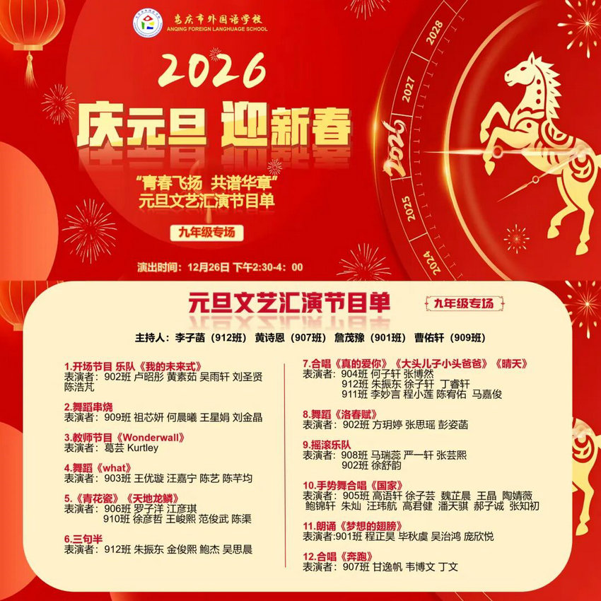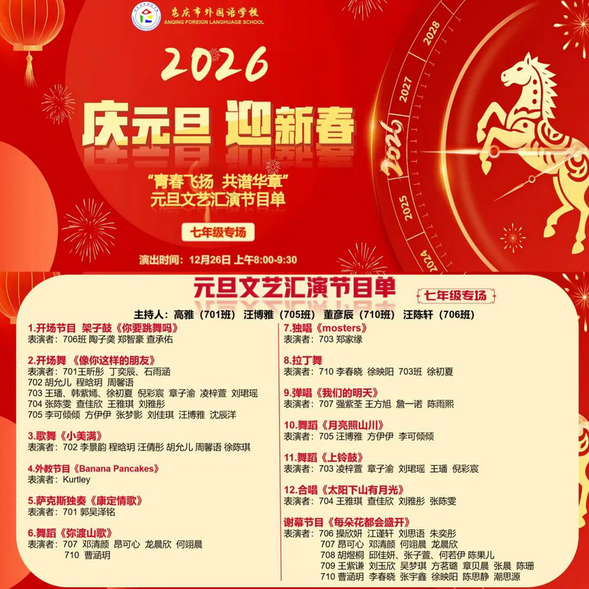 欢声笑语辞旧岁,策马扬鞭踏新程。本次庆元旦迎新系列活动,既是一场欢乐满满的节日盛会,更是一堂生动鲜活的德育实践课。孩子们在活动中品年味、展风采、强体魄、懂感恩。2026年的崭新画卷已然展开,愿安外师生们,带着学校的祝福与期许,如骏马般志存高远、奋勇争先,在成长路上奔腾向前,书写属于自己的精彩华章!