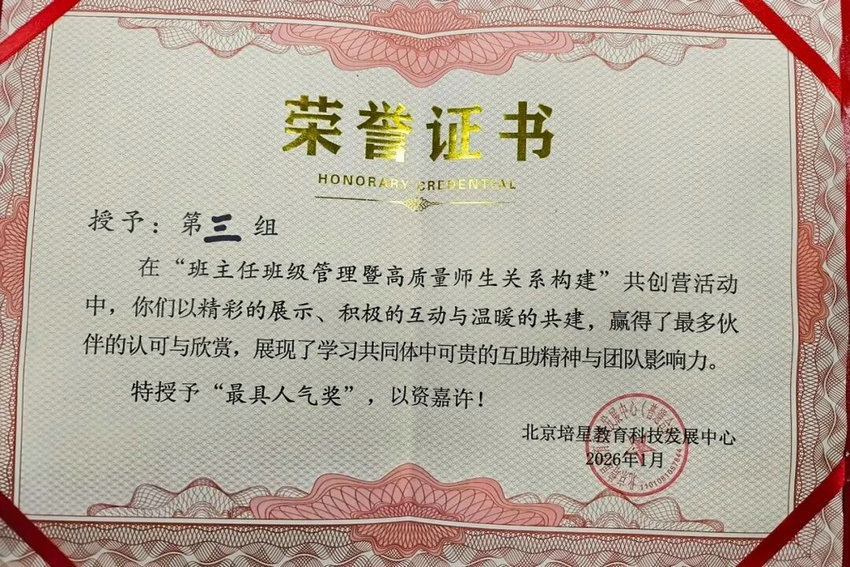 此次共创活动中,我校班主任团队所在的第三小组不仅收获了来自其他各组的肯定与点赞,更是在跨组点评、专家指导下打破常规认知,拓宽了班级管理应对思路,启迪了班级管理应对策略,深化了对班级管理与师生关系的理解。此次活动评选“最佳团队”奖和“最具人气”奖各一名,第三小组在全体成员的努力下,荣获了“最具人气奖”称号。
