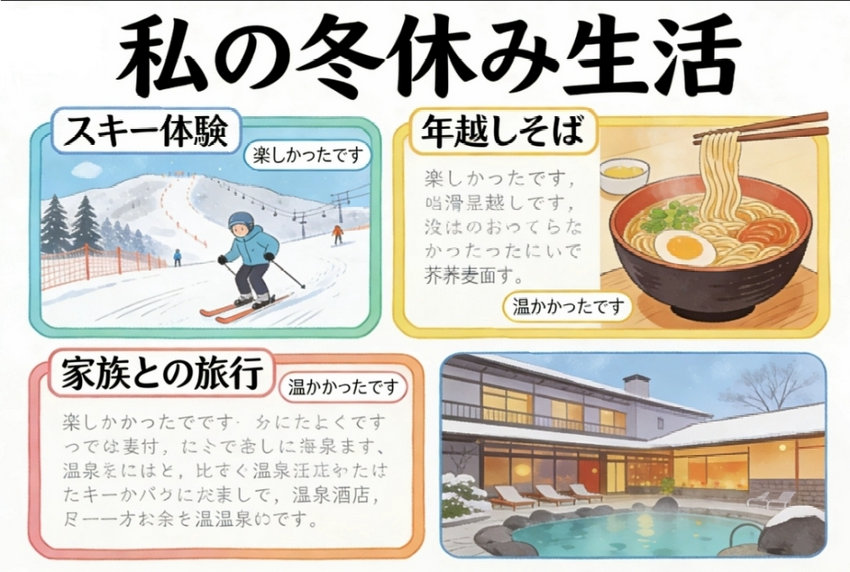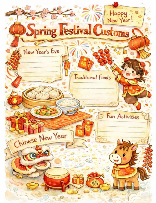 1、日语新年主题手账制作以|我的寒假」为主题制作日语手账,内容包含3-5个寒假场景(如吃年夜饭看春晚、逛公园),每个场景用1句日语描述+手绘插画,标注假名和中文翻译。