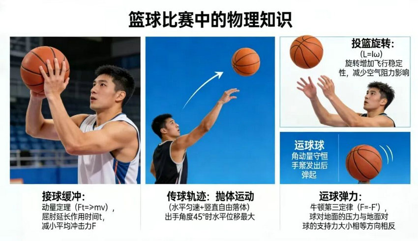 以物理的视角解说一段篮球赛片段。(包含物理知识点及其应用,如接球时屈肘是为了缓冲接球时的冲击力。)