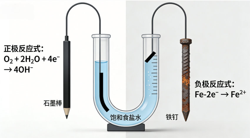 电化学小制作:用石墨棒+铁钉·饱和食盐水制作简易吸氧腐蚀装置,观察铁锈成及导管液面变化,制作简易模型并标注电极反应式,提交实物照片+原理说明(若有视频也可提供)。