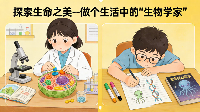 主题:探索生命之美--做个生活中的“生物学家”这个寒假,希望你不再只是背诵知识点,而是用眼睛去发现、用双手去探索、用大脑去思考。生物学:就在我们呼吸的空气,品尝的食物和窗外的世界里。