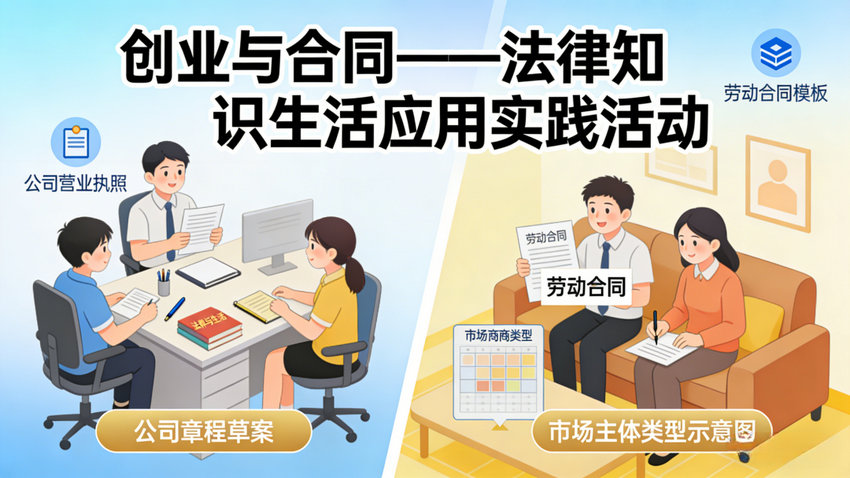 设计亮点:应用《法律与生活》知识,在模拟场景中理解市场主体、劳动关系等慨念。