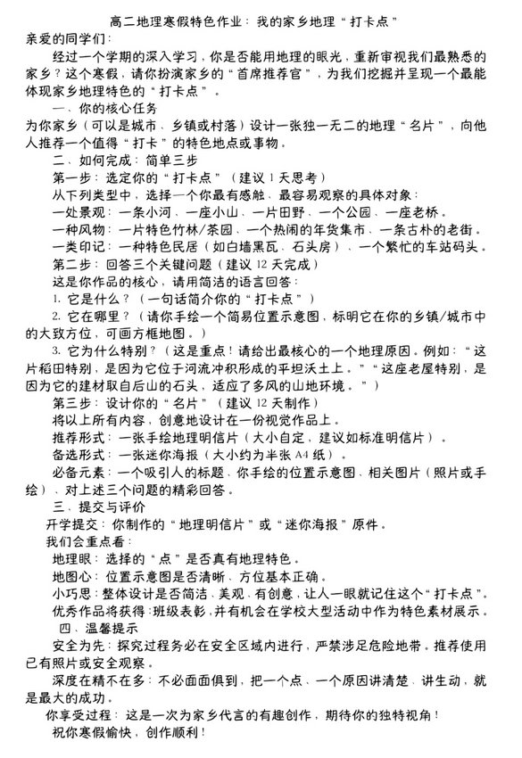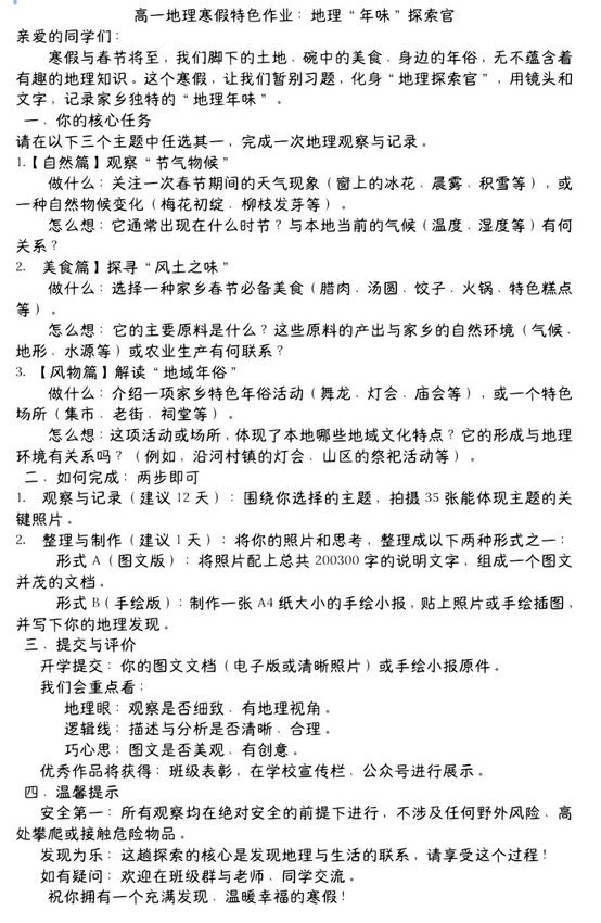 时序更替,冬意渐浓,愉快的寒假已然启程。为落实“关爱生命,卓越成长”的办学理念,同时兼顾学业巩固与素养提升,衔接新高考要求,我校高中部精心设计了本次寒假特色作业,让同学们在劳逸结合中夯实基础、拓展视野,让这个冬天成为沉淀自我、蓄力成长的黄金时光。