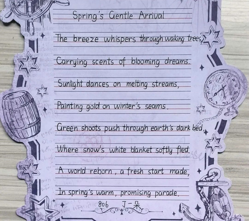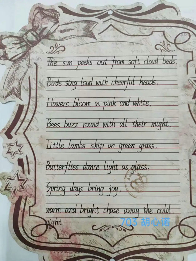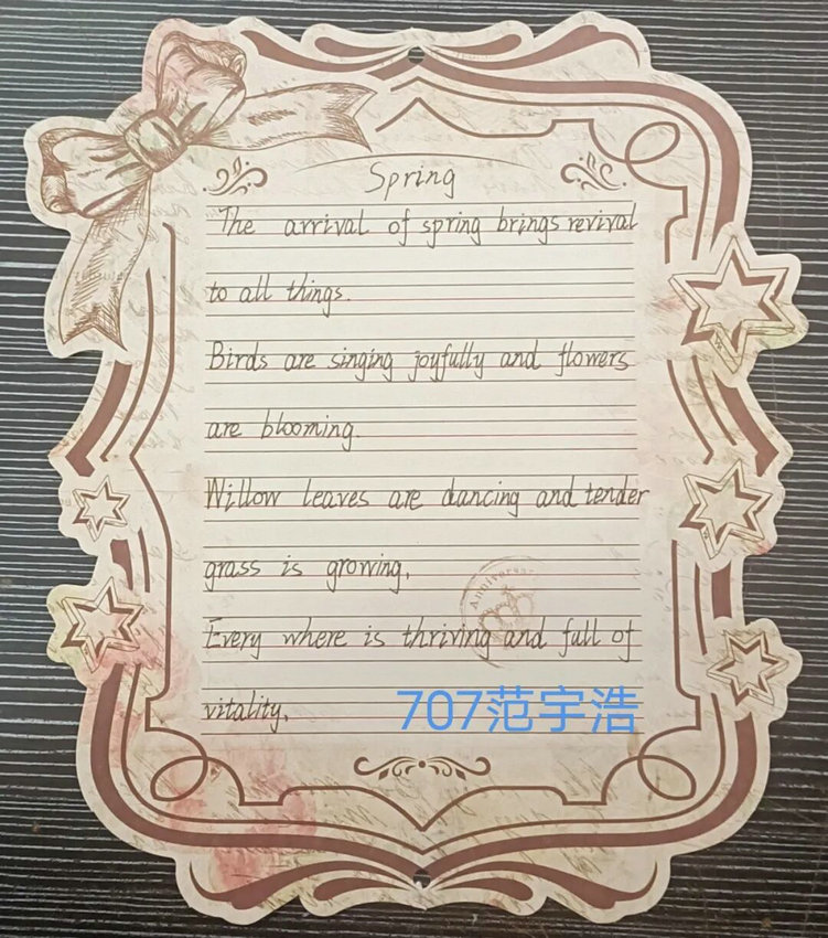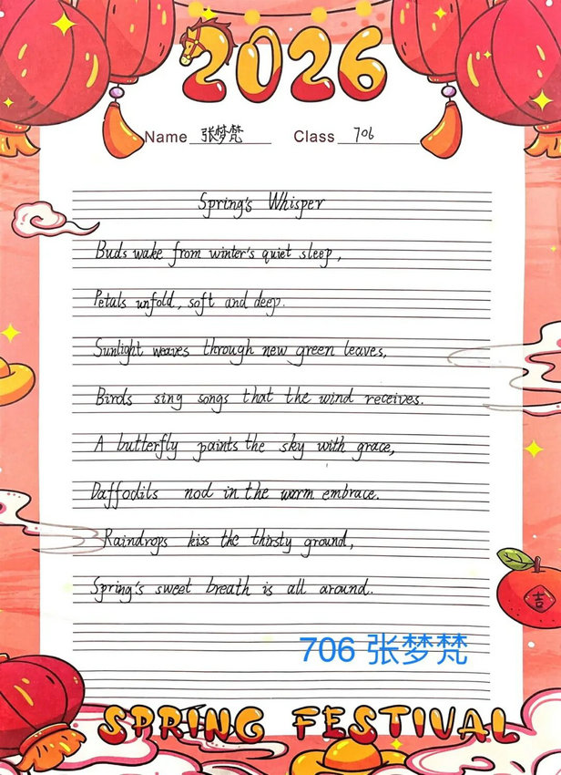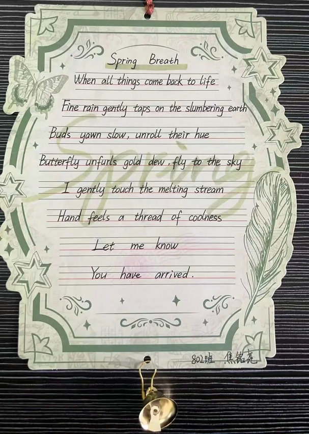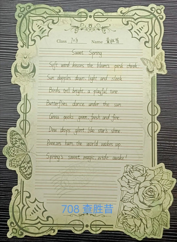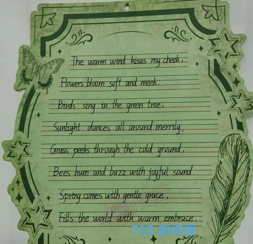 春风入诗,英文传情。灵动的文描摹春日盛景,抒写少年心怀。在词句韵律中我们邂逅诗意,在创作表达中我们品味语言之美,中西文化的交融,点亮了假期里的浪漫与才情。