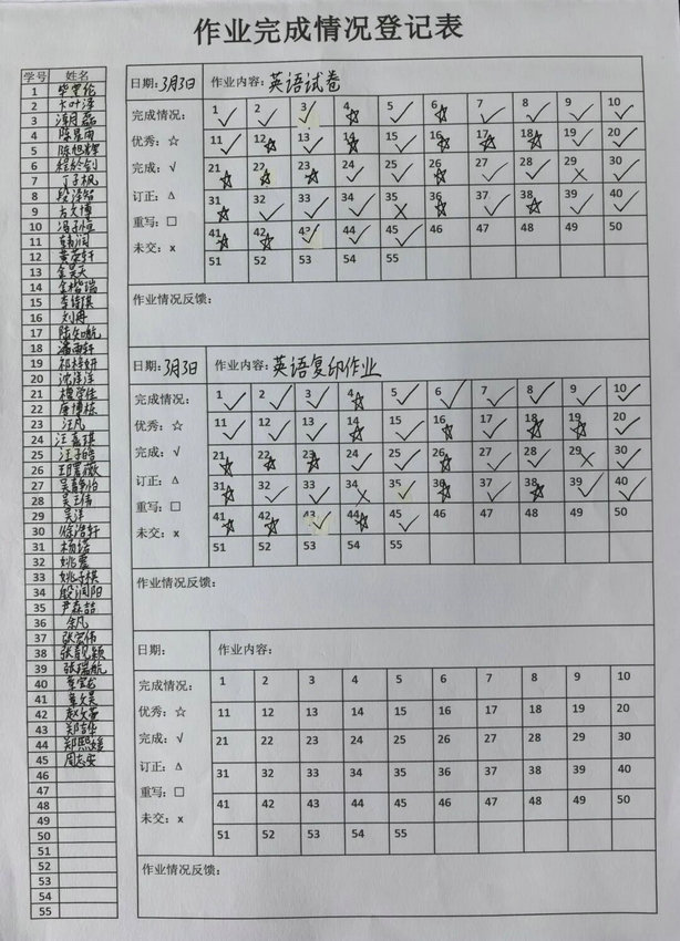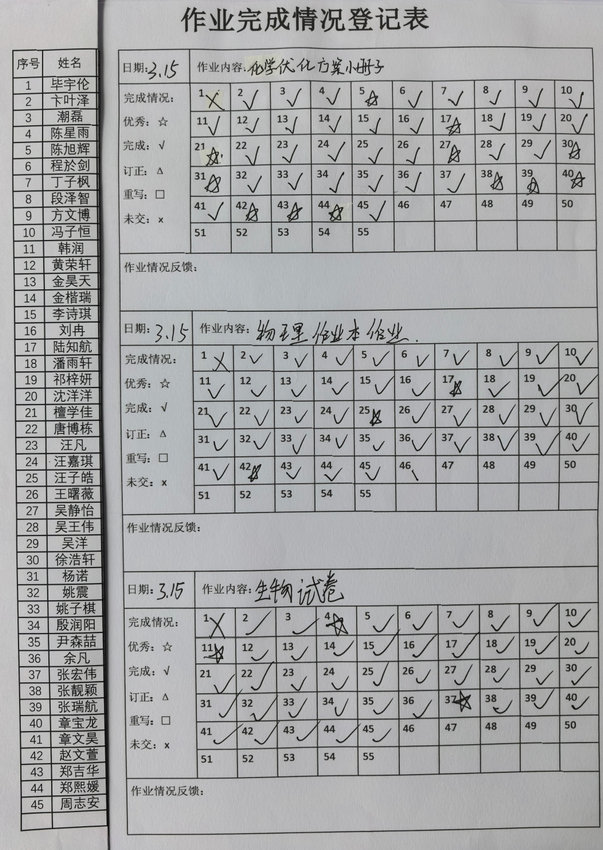 作业是检验学习效果的重要标尺,查老师高度重视作业管理,构建“布置—监督—批改—反馈—订正—复盘”的闭环管理体系。在校期间,严格要求学生按时、保质完成作业,杜绝抄袭、拖延、敷衍等现象;安排班干协助监督作业完成情况,及时反馈未交作业名单,班主任逐一沟通原因,督促补做。