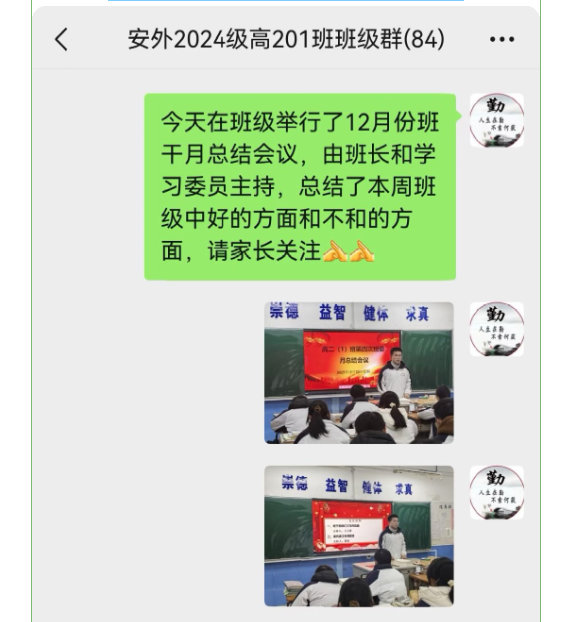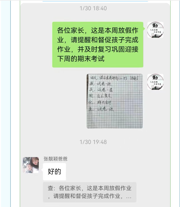 家校协同是班级管理的重要保障,查老师始终重视家校沟通,精心维护家长群,搭建起家校“连心桥”。他每日在群内同步班级日常、学习进度及作业要求,让家长实时掌握学生在校情况;定期分享学生成长亮点,主动与家长沟通学生学习、行为问题,倾听意见、共定改进方案,凝聚“家校同心、携手育人”的合力,为学生成长保驾护航。