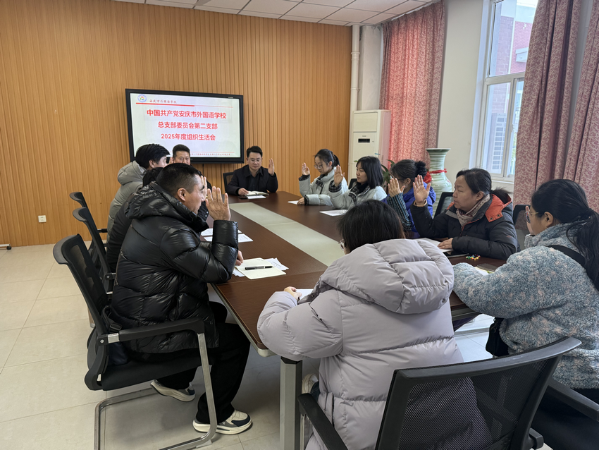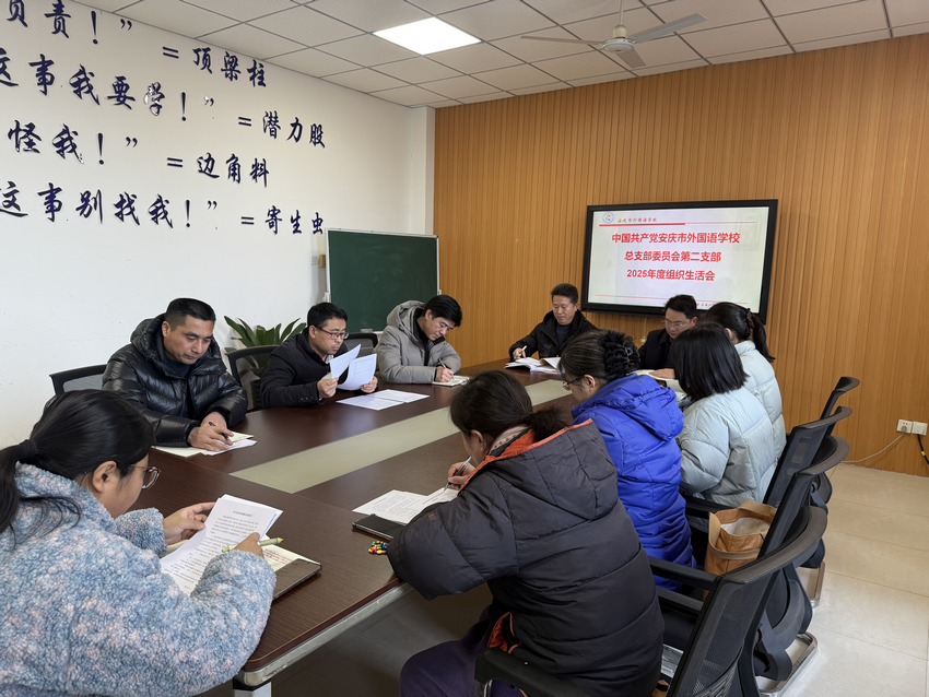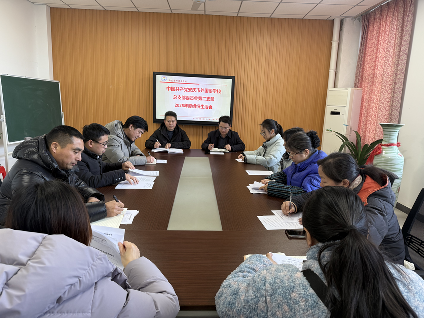 2026年元月28日安庆市外国语学校第二党支部在二楼会议室召开了2025年度组织生活会暨民主评议党员会议。组织生活会的主题是:深入学习贯彻习近平新时代中国特色社会主义思想,全面贯彻落实党的二十届四中全会精神,以打攻坚战、持久战的决心和恒心,契而不舍落实中央八项规定精神,推进作风建设常态化长效化,以优良作风凝心聚力、真抓实干,奋力开创中国式现代化建设新局面。第二党支部全体党员参加会议。会议由第二支部书记徐海宏主持。