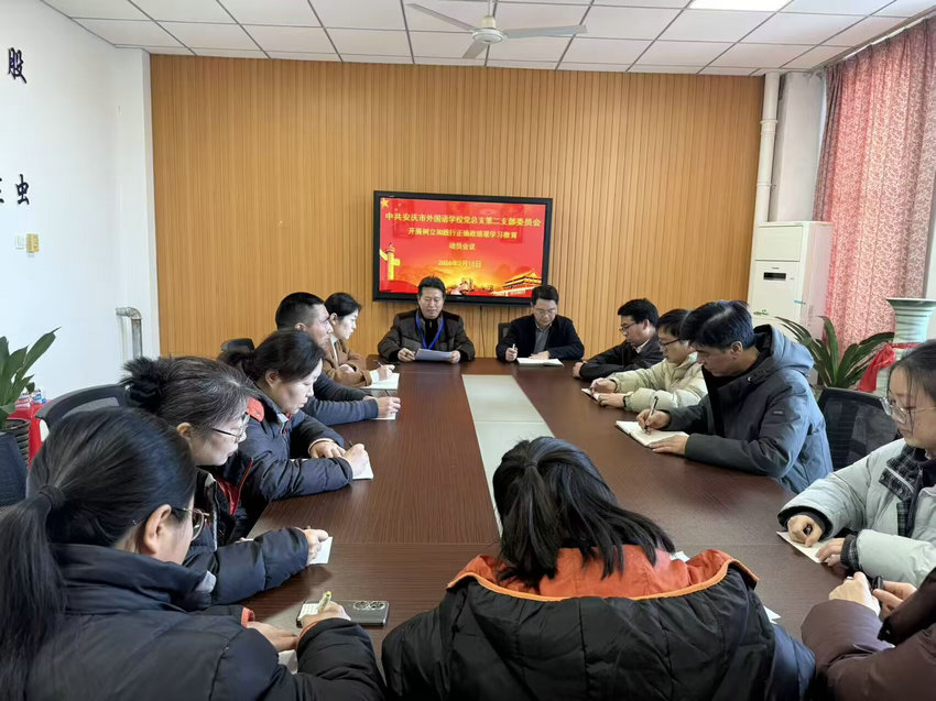 3月10日,中共安庆市外国语学校党总支第二支部开展树立和践行正确政绩观学习教育动员会,会议传达学习中央《关于在全党开展树立和践行正确政绩观学习教育的通知》和市委相关会议精神,会议根据学校党总支《关于在安庆市外国语学校开展树立和践行正确政绩观学习教育的实施方案》,对第二支部开展政绩观学习教育进行动员安排。第二支部书记徐海宏主持会议。第二支部委员、高中部负责人徐最太和第二支部全体党员参加会议。