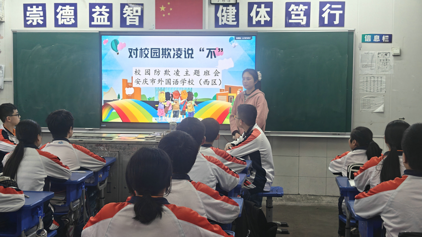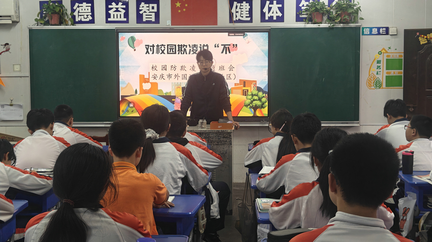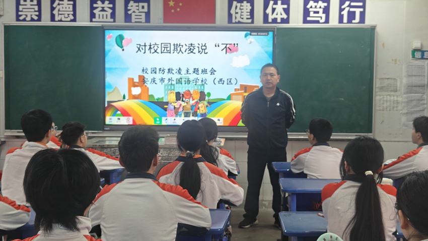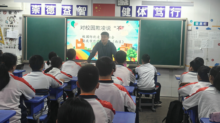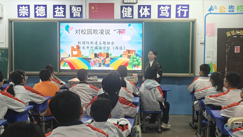为筑牢校园安全防线,守护学生身心健康,今日下午,安庆市外国语学校西区各班级召开 “拒绝校园欺凌,共建平安校园” 主题班会,通过多媒体课件与视频结合的形式,为学生带来一堂生动的防欺凌教育课。