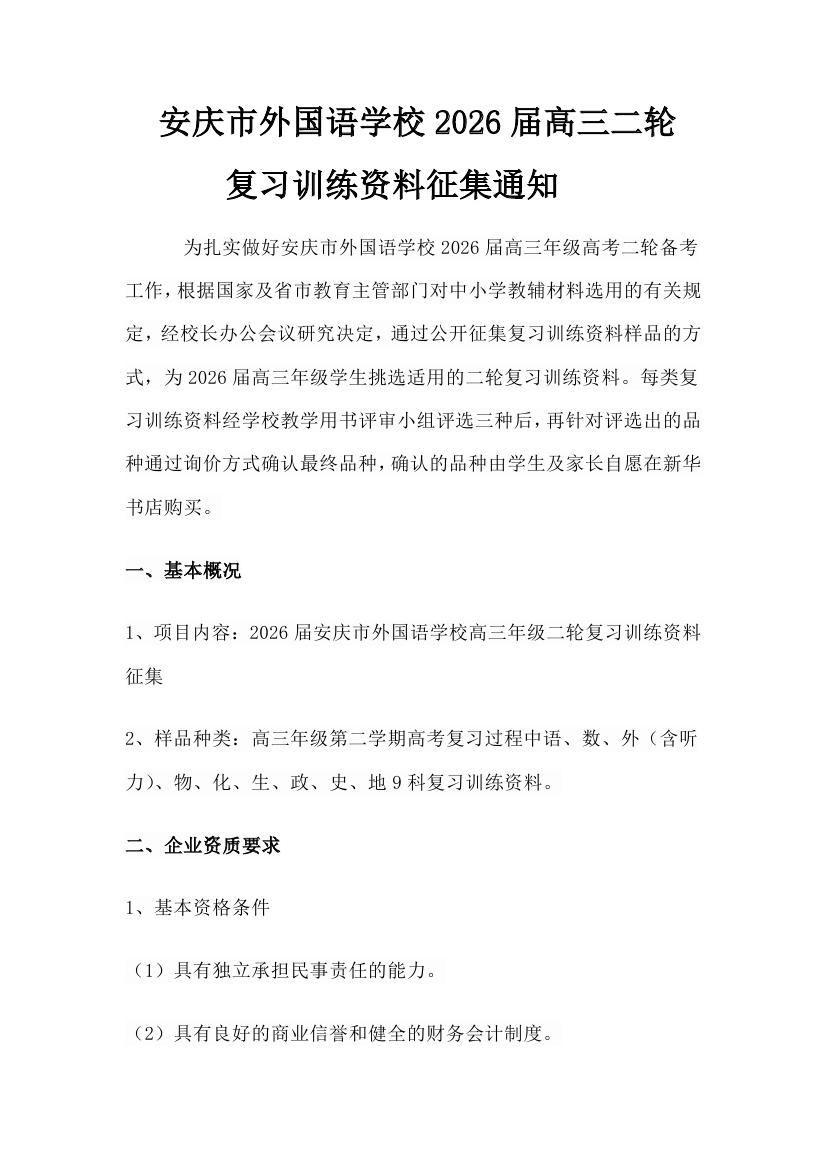 安庆市外国语学校2026届高三二轮复习训练资料征集通知