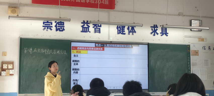 1月12日星期一下午第二节课,高中部304班的政治课堂里,晏玉婷老师执教的《在生活中学民法用民法》推门听课活动顺利开展。肖清克副校长、徐最太校助,高中部江生友、徐海宏、朱炎炎主任,国际部王银钗主任及政治教研组长周文凯老师走进课堂,近距离观摩教学实况,为课堂教学质量精准把脉。