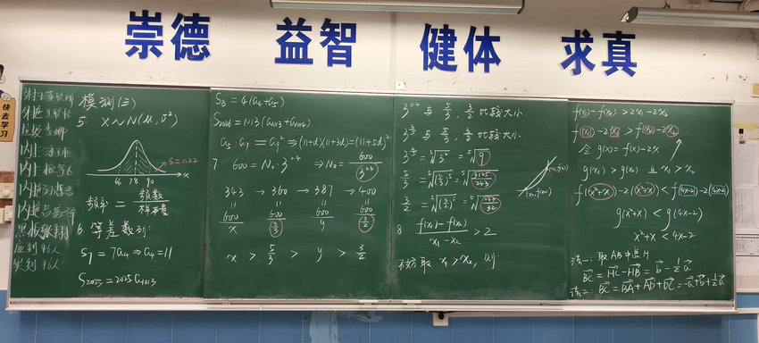 课堂之上,汪南老师以试卷题目为核心载体,围绕正态分布、等差数列、数值大小比较、函数单调性等高三数学高频考点,展开条理清晰、逻辑严密的试卷讲评。黑板上,汪老师的板书工整规范、层次分明,从正态分布的图像与概率计算,到等差数列的通项与求和推导,再到幂数大小比较的根式转化、函数单调性的作差证明,每一道题的解题步骤、思路推导、易错点拨都清晰呈现,既搭建了完整的知识框架,又标注了关键解题技巧,成为学生梳理思路、查漏补缺的直观抓手。授课中,汪老师依托板书层层拆解考点,既梳理了题型的通用解题方法,又针对学生易错点进行精准点拨,引导学生规范答题、梳理解题逻辑,充分发挥了高三习题讲评课“查漏补缺、巩固提升”的核心作用,展现出扎实的教学功底与精准的备考把控能力,课堂氛围专注高效,学生参与度高。
