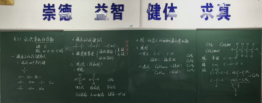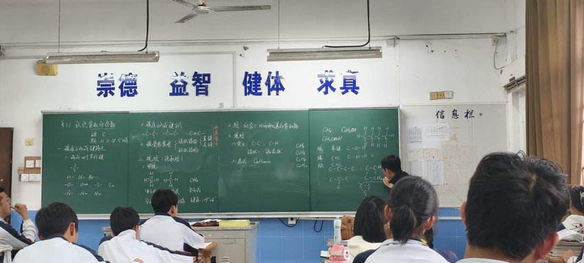 课堂伊始,周老师以清晰的教学脉络,从有机化合物的核心元素切入,明确碳为核心元素,氢、氧、氯等为辅助元素,为学生锚定学习基础。随后,老师聚焦“碳原子的成键特点” 这一重难点,结合板书详细讲解碳原子形成四个共价键的特性,让学生直观理解有机化合物种类繁多的结构根源。