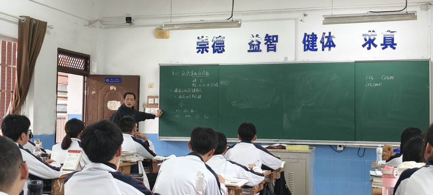 为深化课堂教学研讨,助力教师打磨教学细节、提升教学质量,4 月 13 日下午,我校高中部开展化学组推门听课活动。肖清克副校长、徐最太校助、高中部江生友副主任、徐海宏副主任、朱炎炎副主任、国际部王银钗主任,以及化学组教研组长查显庆老师、邹定风老师齐聚高中部 104 班,全程聆听周四新老师执教的新课《认识有机化合物》,共同探寻有机化学入门课的教学精髓。