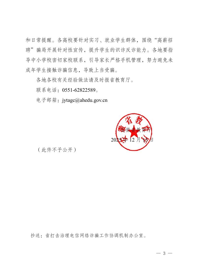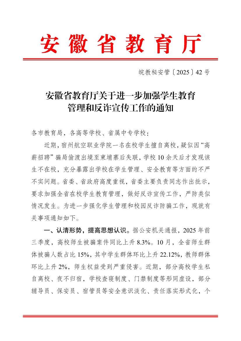 安徽省教育厅关于进一步加强学生教育管理和反诈宣传工作的通知