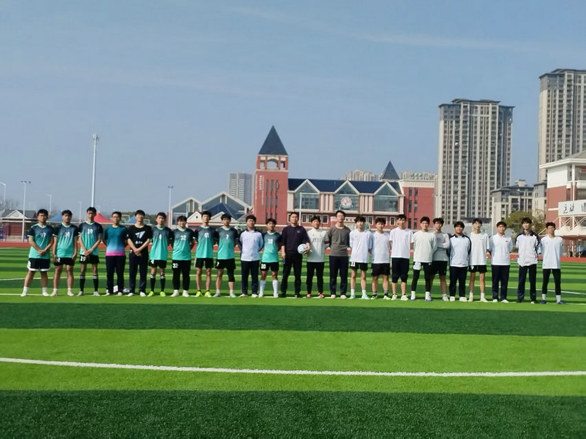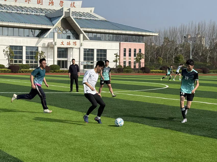 春潮涌动,活力飞扬。为迎接新学期到来,丰富高二学子校园文体生活,锤炼团队协作精神,3 月 20日,安庆市外国语学校高中部足球社、体育组共同承办的高二迎新足球赛在校园绿茵场火热开赛。赛场上,球员们奋勇拼搏、挥洒汗水,最终双方以 2:2 的比分握手言和,为全场观众呈现了一场精彩绝伦的足球盛宴。本次比赛由吴汉文老师担任裁判,校长助理徐最太、高中部德育分管主任徐海宏亲临现场观赛,为参赛球员加油鼓劲。