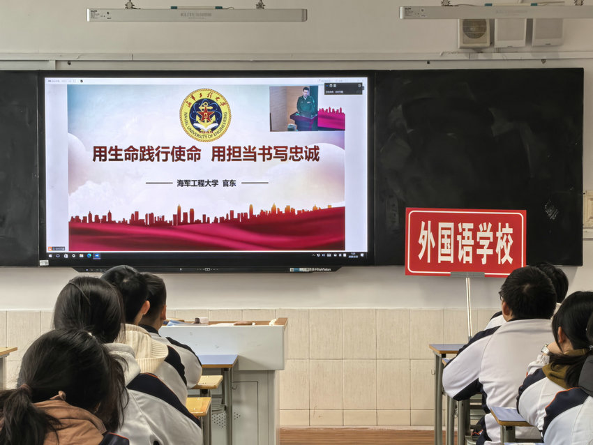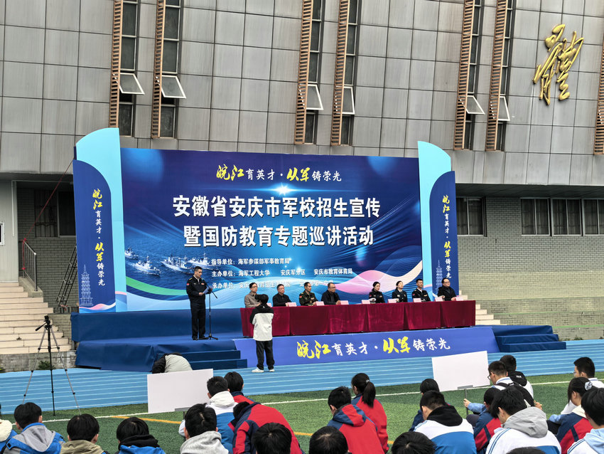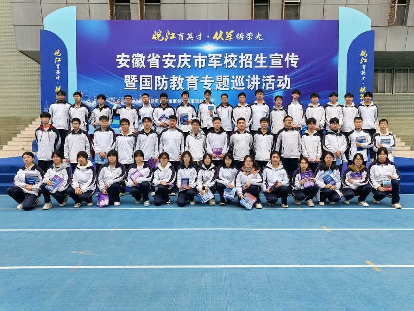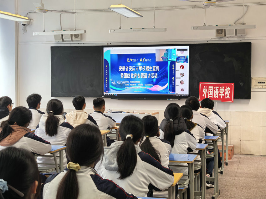为厚植学生爱国情怀,坚定强军报国志向,让学子近距离了解国防知识与军校招生政策,3 月 22 日,安庆市外国语学校组织 50 名高二、高三学生及家长代表,赴安庆一中(龙门校区)参加由海军参谋部军事教育局指导,海军工程大学、安庆军分区等单位主办的 “皖江育英才・从军铸荣光” 国防教育专题巡讲暨本科提前批在皖招生军事院校宣传活动,学校带队教师全程陪同参与。