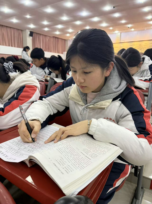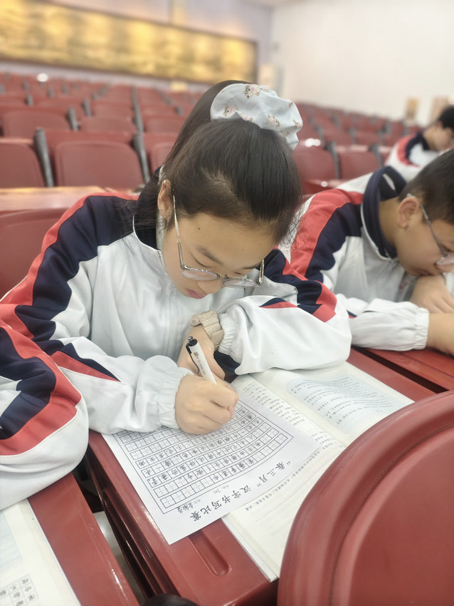本次比赛以“春三月”为主题,分为七、八年级两组。七年级学生书写《紫藤萝瀑布》1-3段,八年级学生书写古诗《送杜少府之任蜀州》和《望洞庭湖上张丞相》。赛场上,参赛学生们坐姿端正,凝神静气,在书写中感受作者笔下的春意盎然,体悟汉字结构中蕴含的生命力