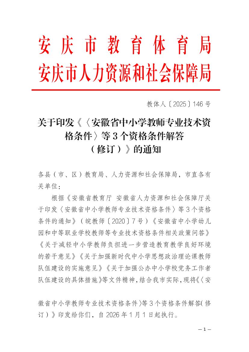 关于印发《〈安徽省中小学教师专业技术资格条件〉等3个资格条件解答(修订)》的通知